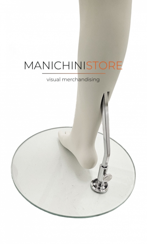 Il manichino è completo di base in vetro del diametro di 30 cm con attacco sia al polpaccio che sotto al piede.