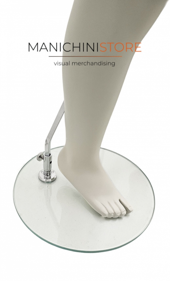 Il manichino è completo di base in vetro del diametro di 30 cm con attacco sia al polpaccio che sotto al piede.