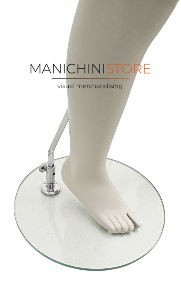 Il manichino è completo di base in vetro del diametro di 30 cm con attacco sia al polpaccio che sotto al piede.