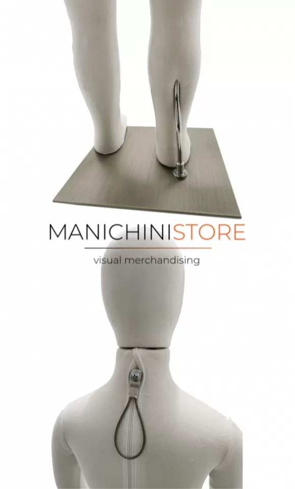 Il manichino è fornito di base quadrata in metallo 25x25 cm. con attacco sotto al piede che non permette l'uso delle scarpe.