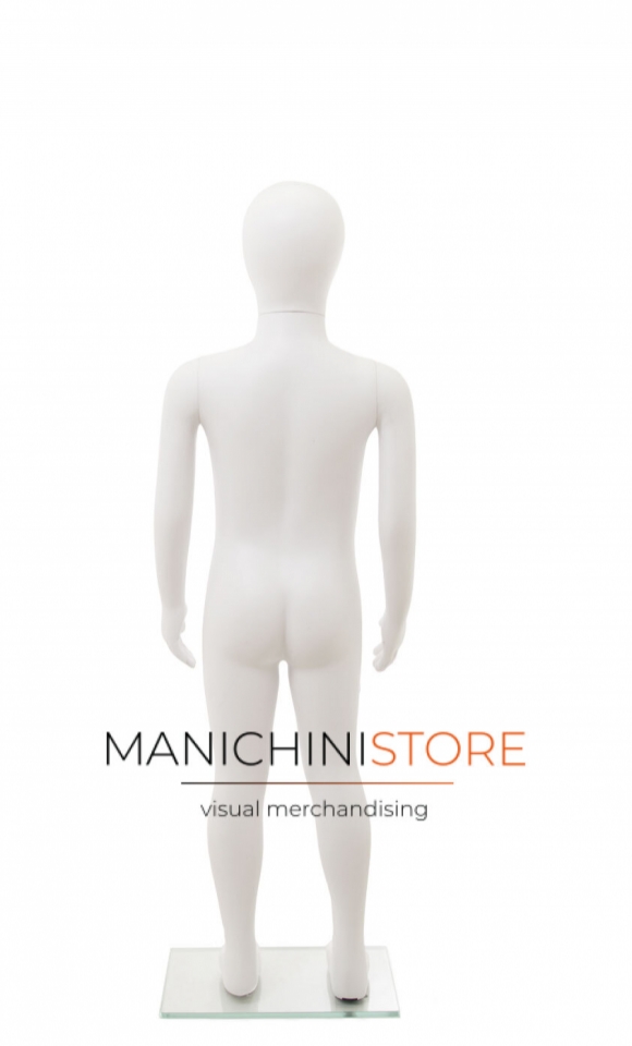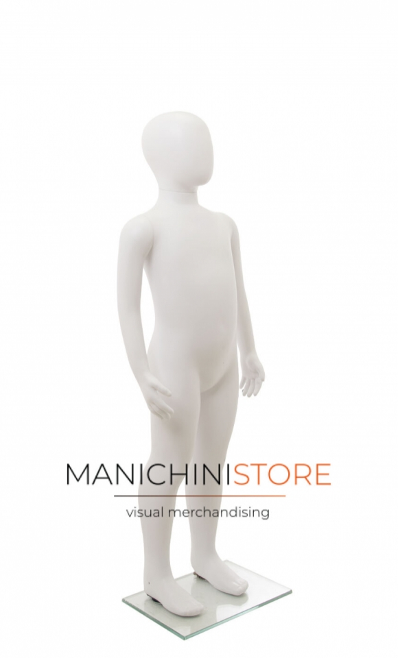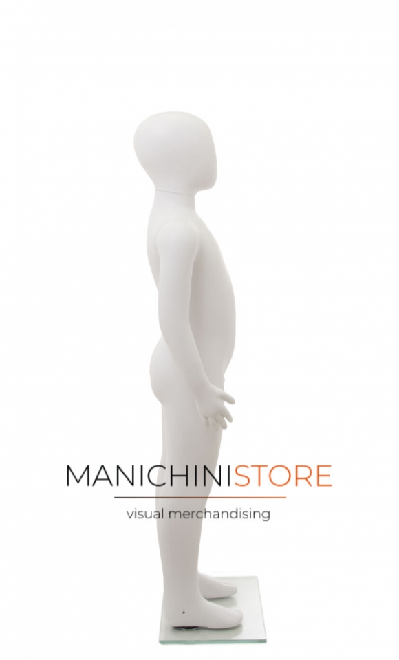 Il manichino bambino ha la testa orientabile ed è dotato di una base rettangolare in vetro temperato 30x20 cm con attacco sotto al piede, e non può quindi indossare calzature.