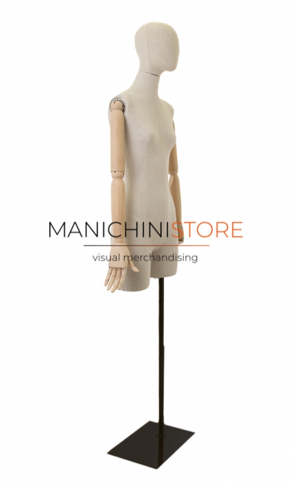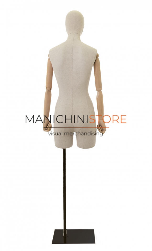 Servizio di noleggio di 1 busto donna con mezza gamba, realizzato in vetroresina rivestita in lino naturale e accessoriato di braccia in legno e completo di testa rivestita dello stesso tessuto.