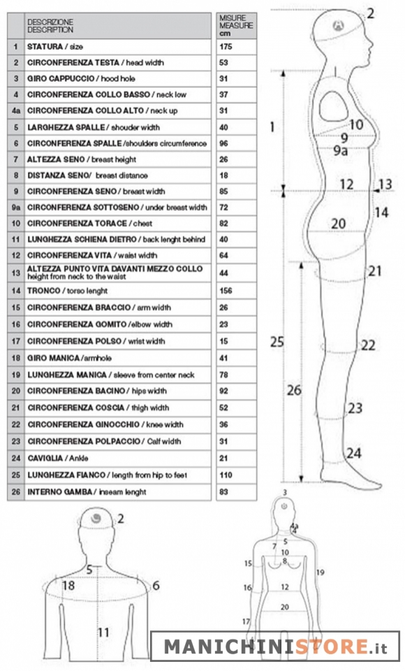 Al momento del ritiro il manichino dovrà essere completo di ogni sua parte e imballato nel suo CARTONE ORIGINALE e nelle stesse condizioni in cui è stato preso in carico. Qualsiasi danneggiamento, rottura o parte mancante verrà addebitata.