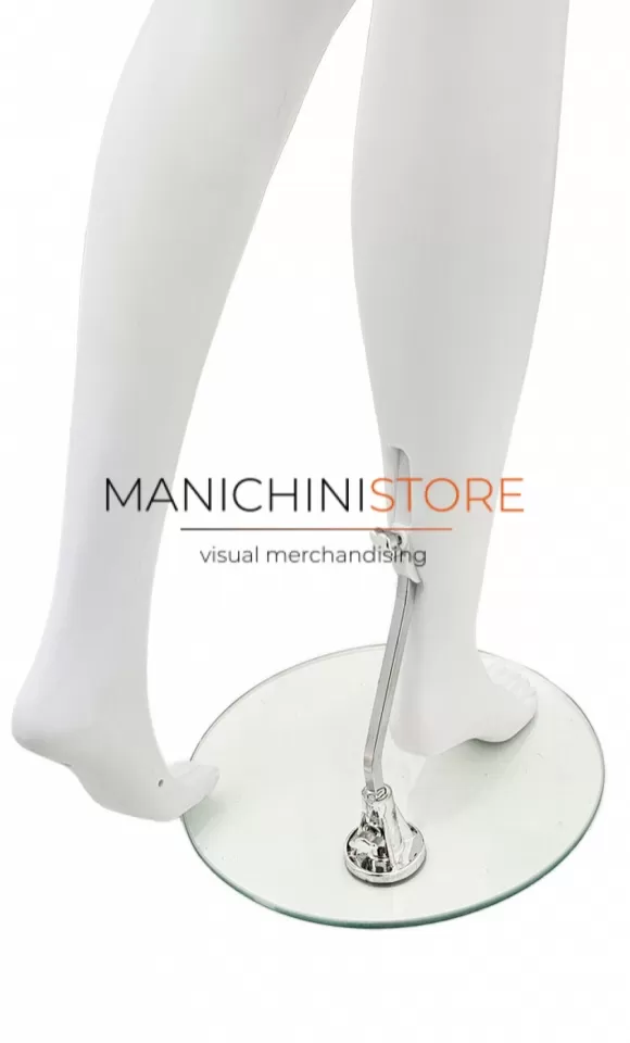 Il manichino è fornito di una base tonda in vetro temperato del diametro di 34 cm con attacco al polpaccio che consente di indossare le calzature.