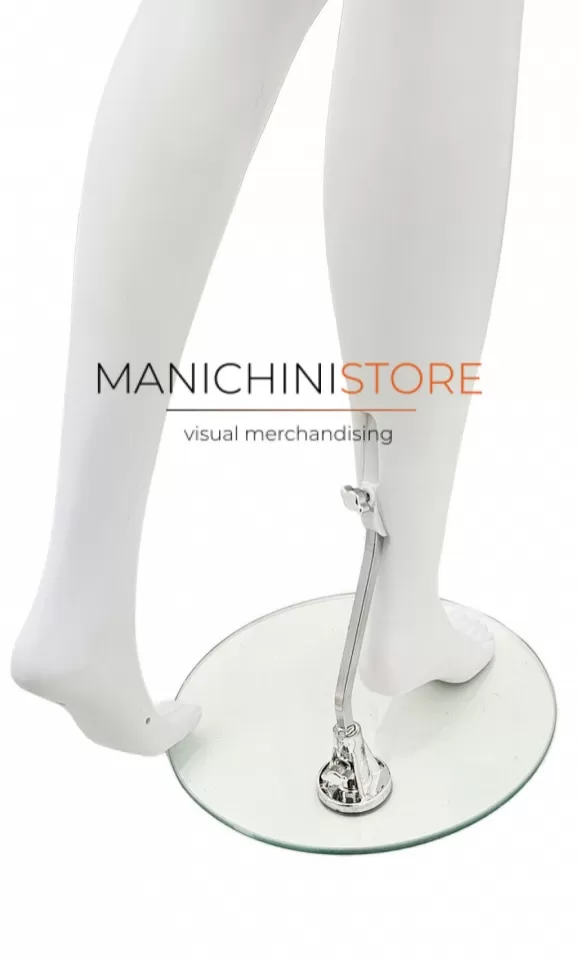 Il manichino è fornito di una base tonda in vetro temperato del diametro di 34 cm con attacco al polpaccio che consente di indossare le calzature.