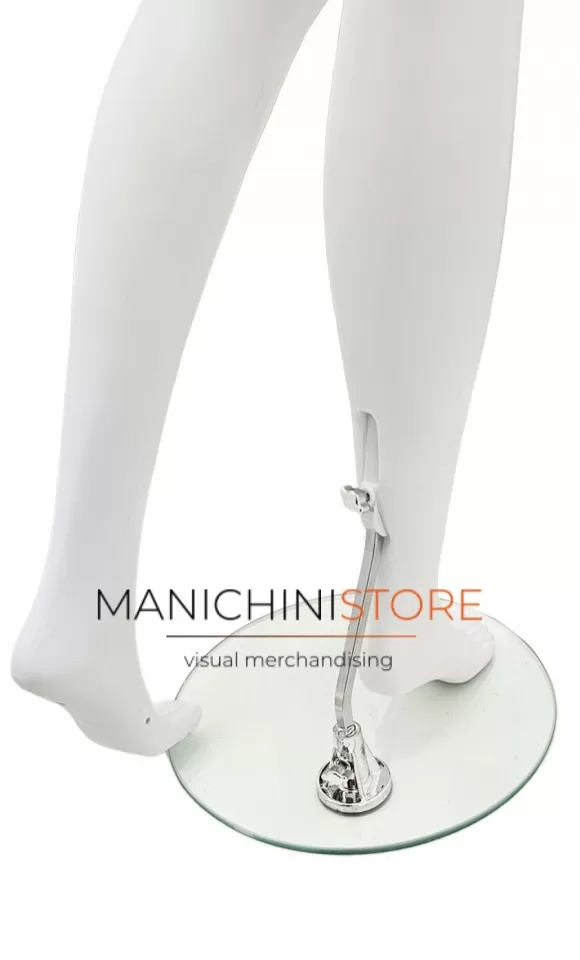 Il manichino è fornito di una base tonda in vetro temperato del diametro di 34 cm con attacco al polpaccio che consente di indossare le calzature.
