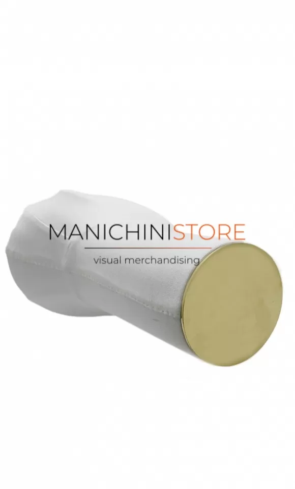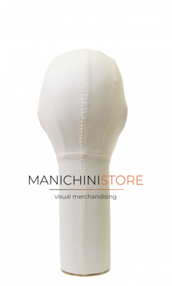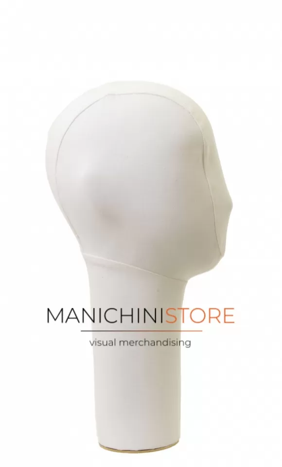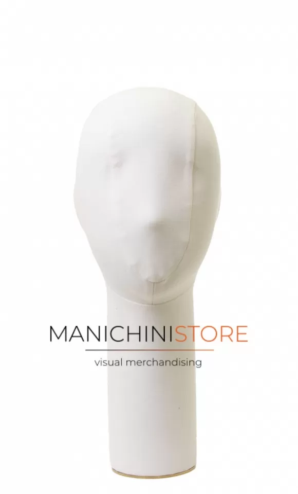 Bellissima testa espositiva unisex in vetroresina e rivestita in tessuto bianco panna completa di base in metallo color oro.