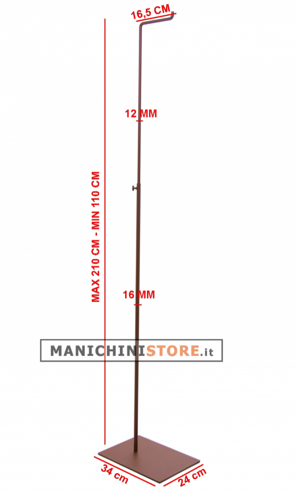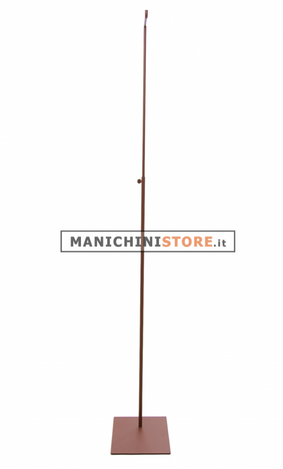 Elegante espositore porta abiti di fabbricazione Made in Italy realizzato in metallo verniciato ruggine regolabile in altezza da 110 a 210 cm. L'espositore saprà esporre con eleganza i vostri capi di abbigliamento e accessori come borse, collane, sciarpe e altri articoli che necessitano di un supporto.