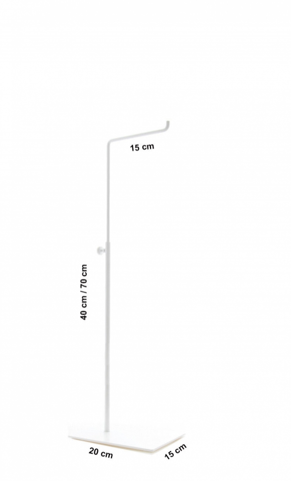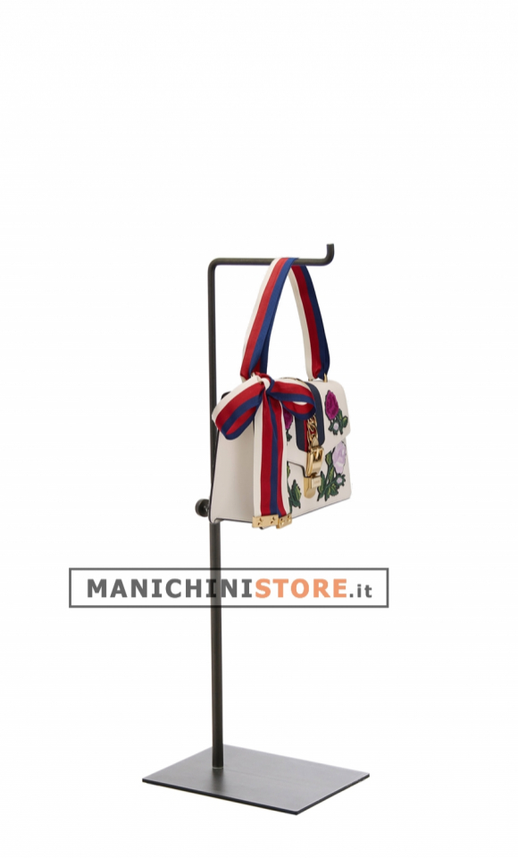 Espositore porta borse e accessori moda di fabbricazione Made in Italy realizzato in ferro grezzo verniciato trasparente regolabile in altezza da 40 a 70 cm. L'espositore saprà esaltare con estrema eleganza i vostri accessori come borsette, collane, sciarpe e altri articoli che necessitano di un supporto.