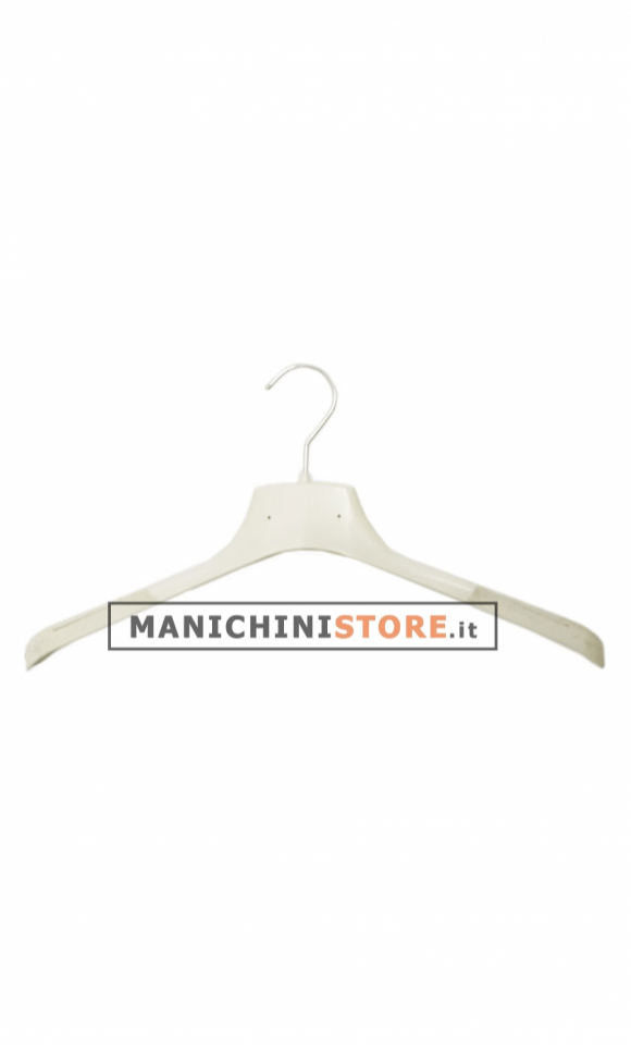 Pratica ed economica gruccia capospalla di fabbricazione Made in Italy realizzata in plastica beige con velluto antiscivolo sulla spalla e pratiche alette che permettono di appendere anche canottiere e vestiti.