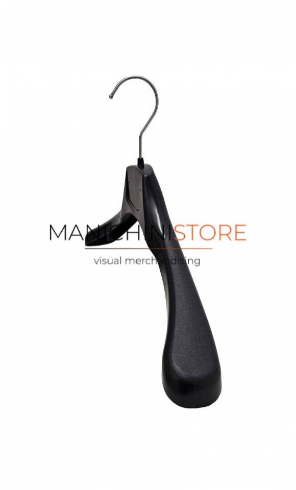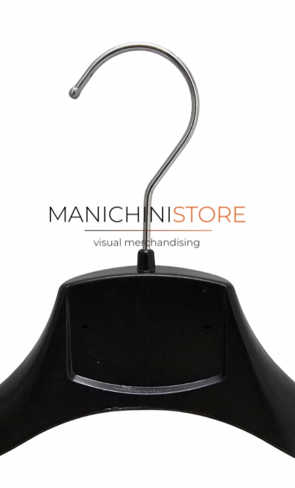 Funzionale ed economica gruccia capospalla di fabbricazione Made in Italy realizzata in plastica nera.