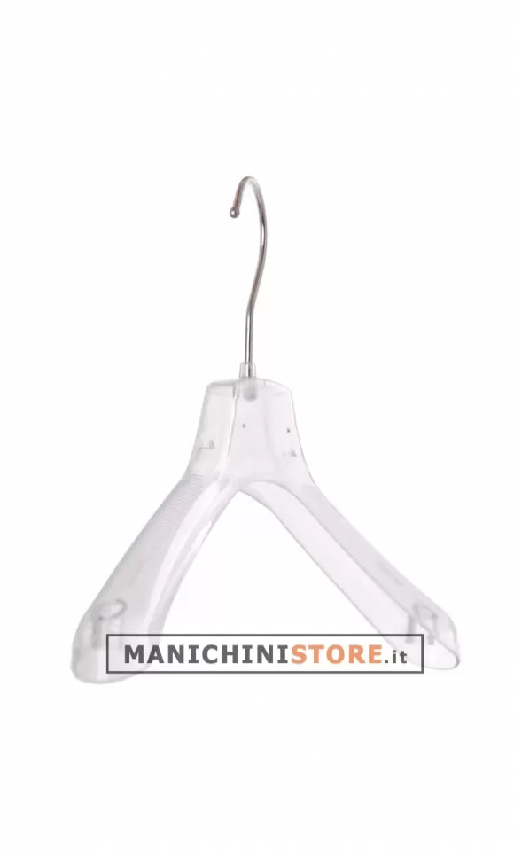 Pratica ed economica gruccia capospalla di fabbricazione Made in Italy realizzata in plastica trasparente con zigrinatura sulla spalla.