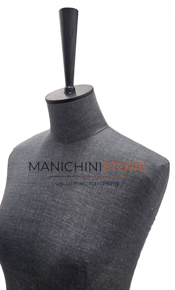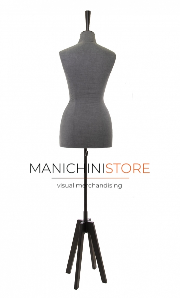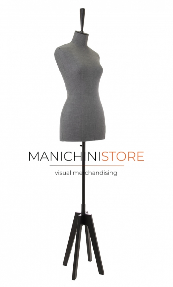 Busto donna in vetroresina rivestito in tessuto grigio completo di base Cross a 4 piedi in legno verniciato nero e di teminale champagne in legno verniciato nero della lunghezza di 16 cm.