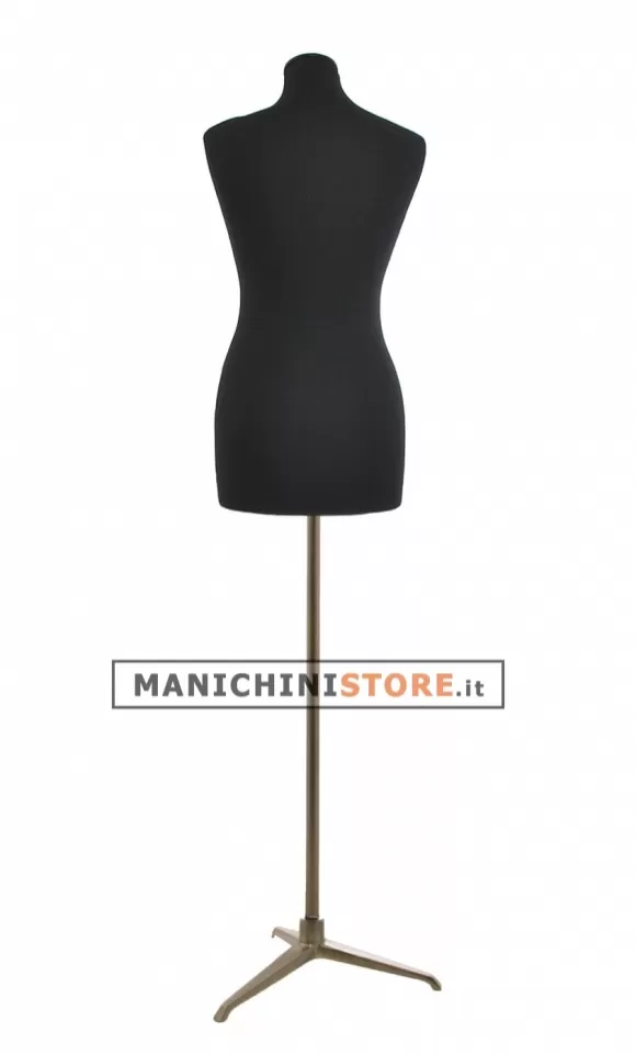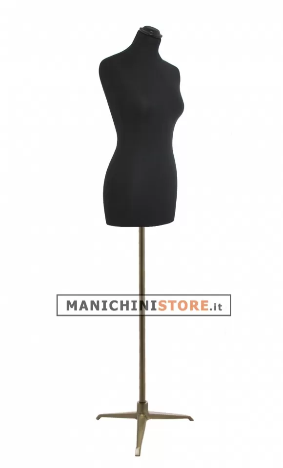 Il busto rivestito di una elegantissima e pratica maglina di colore nero lavabile in lavatrice, è dotato di una base treppiede in ferro verniciato in color bronzo ed è completo di tappo in legno nero.