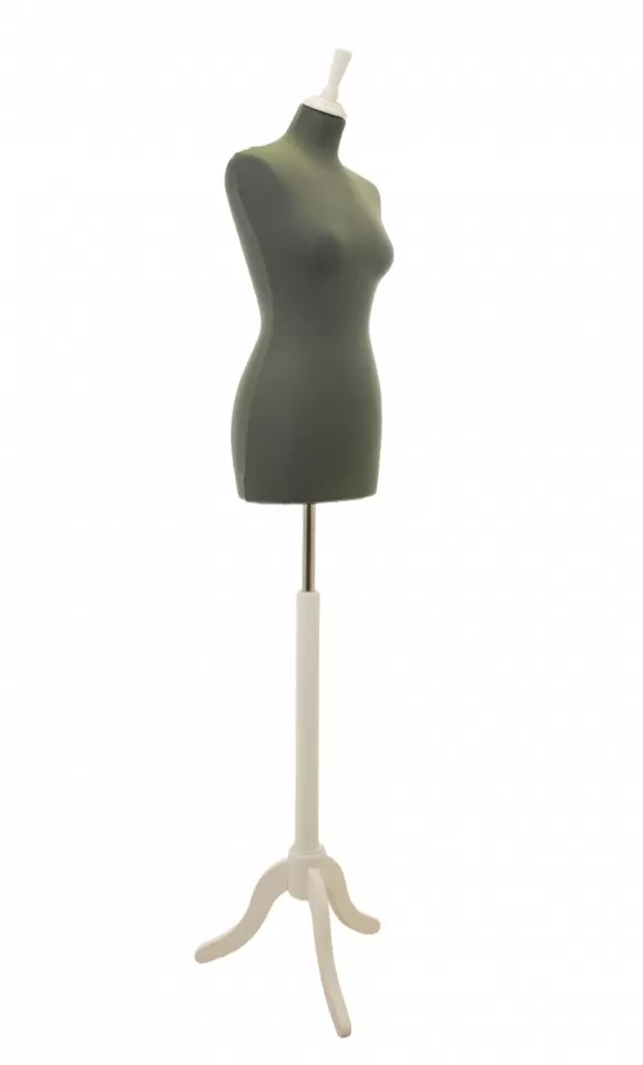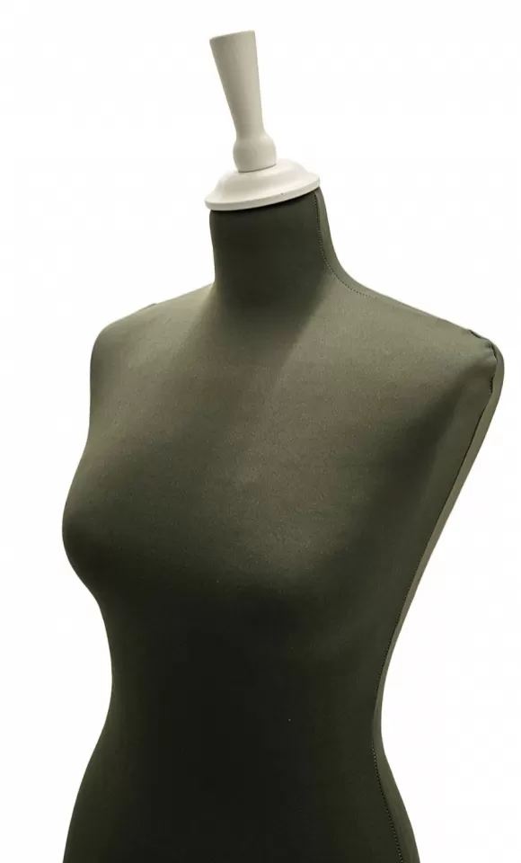 Il busto, regolabile in altezza da 158 a 179, è dotato di una raffinatissima base treppiede in legno verniciato bianco; inoltre è completo di terminale a champagne in legno ed è rivestito con una maglina in cotone elasticizzato di colore verde lavabile in lavatrice.