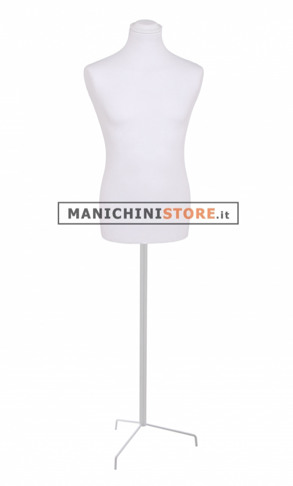 Il busto è accessoriato di una bellissima base treppiede in metallo verniciato bianco con piantana regolabile in altezza da 179 a 209 cm; inoltre è finito di terminale ed è rivestito con una elegante maglina in cotone elasticizzato bianco lavabile in lavatrice.
