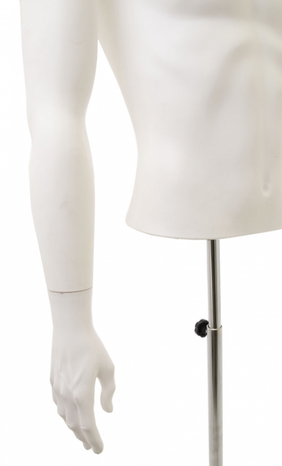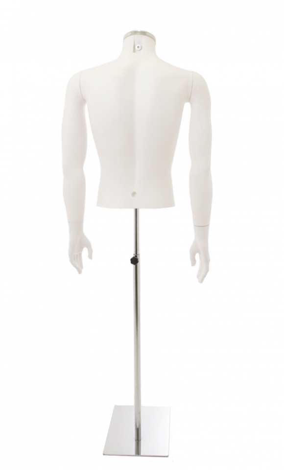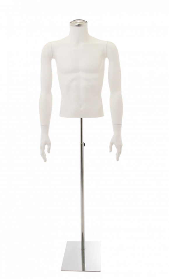 Pratico busto corto da uomo con braccia in plastica bianca e con terminale e base rettangolare 34x24 cm in acciaio.