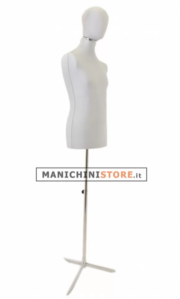 Il busto è dotato di testa e base treppiede in acciaio, regolabile in altezza; inoltre è interamente rivestito con una maglina in cotone elasticizzato lavabile in lavatrice.