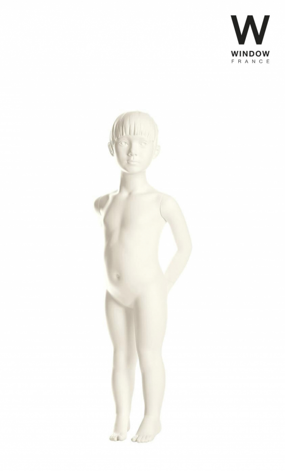Manichino bambina dalla testa scolpita, di età 2 anni realizzato in vetroresina e laccato bianco avorio.