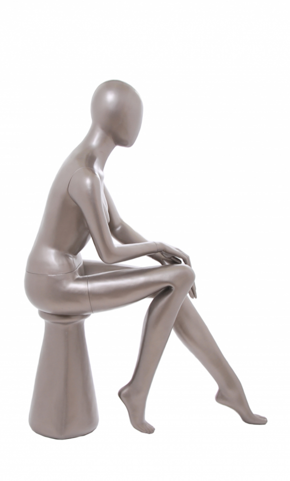 Il manichino, di uno splendido colore nickel, si presenta in posizione seduta con la gamba sinistra leggermente distesa e le braccia naturalmente posate sulle gambe donando all'immagine complessiva un tono signorile e raffinato.