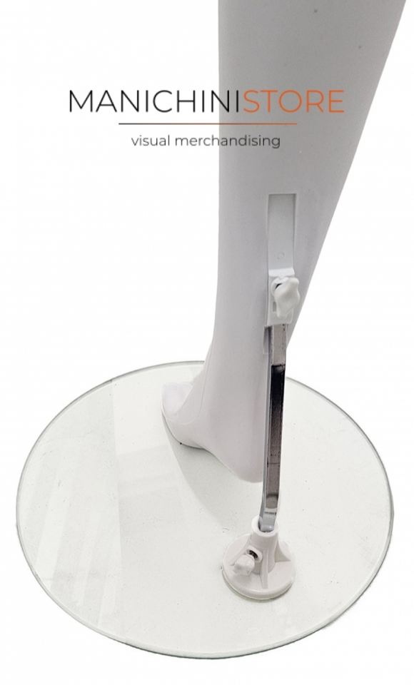 Il manichino è fornito di una base tonda in vetro del diametro di 34 cm con attacco al polpaccio che consente di indossare le calzature e di terminale collo in plastica.