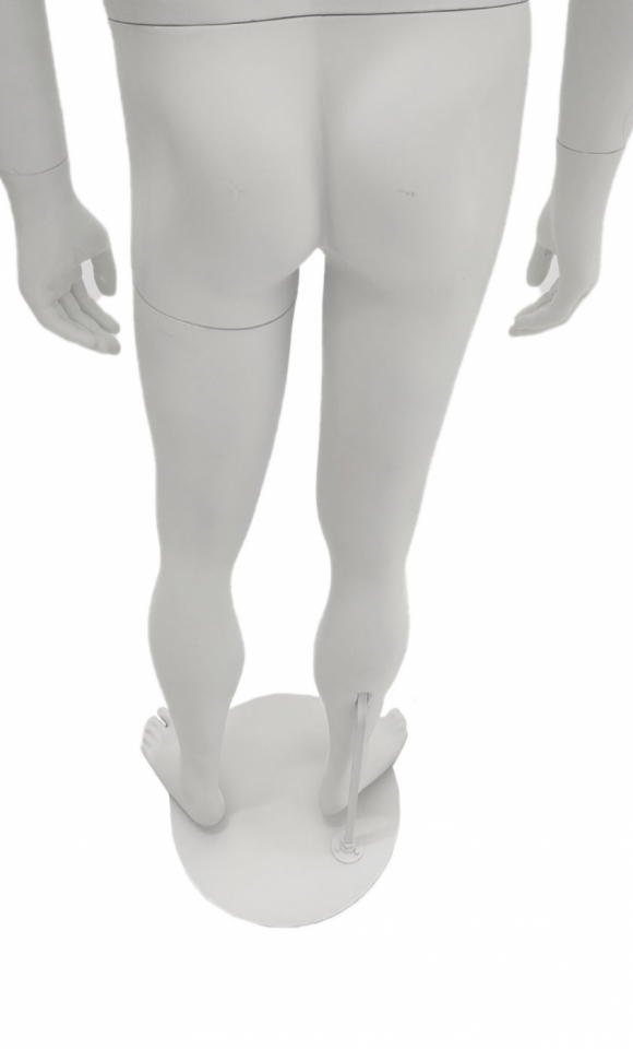 Il manichino uomo dalla testa a uovo è fornito di una base tonda verniciata bianca dal diametro di 37 cm con attacco al polpaccio che consente di indossare le calzature.