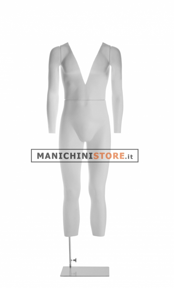 Manichino da uomo per foto cataloghi ed e-commerce con taglio a V (non ricomponibile) realizzato in plastica di colore bianco e fabbricato interamente in Italia.