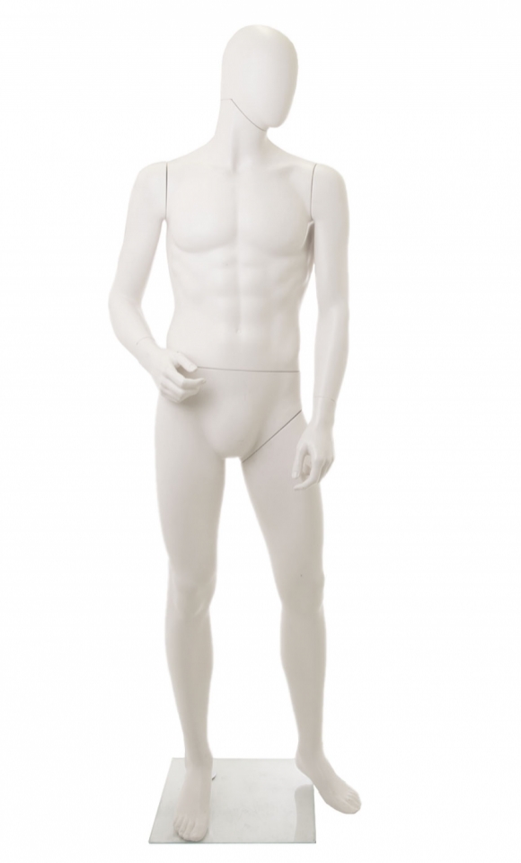 Manichino uomo dalla testa a uovo interamente in vetroresina verniciato bianco opaco, dall’elevata qualità e dalla corporatura asciutta e ben definita.