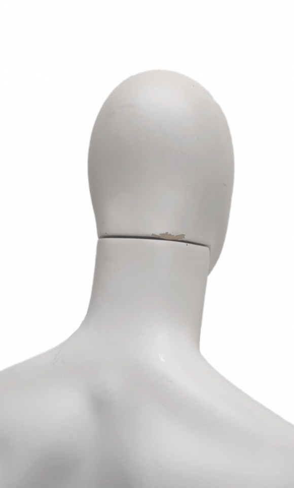 Manichino uomo dalla testa a uovo interamente in vetroresina verniciato bianco opaco, dall’elevata qualità e dalla corporatura asciutta e ben definita.