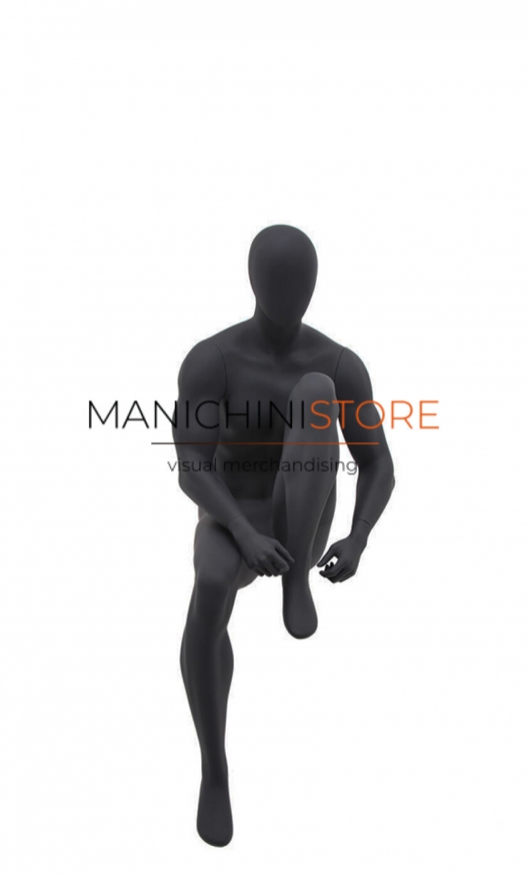Ideale per allestire con dinamica eleganza le vostre vetrine, il manichino dalla posizione seduta in procinto di allacciarsi una scarpa rapprensenta una realistica scena sportiva.