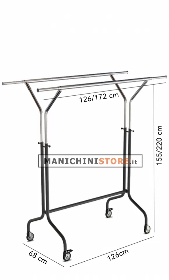 Pratico e comodo stender a doppia barra regolabile in altezza di fabbricazione made in Italy.. Le barre appenderia e i montanti scorrevoli sono sempre cromati, mentre il resto della struttura può essere nelle finiture a catalogo.