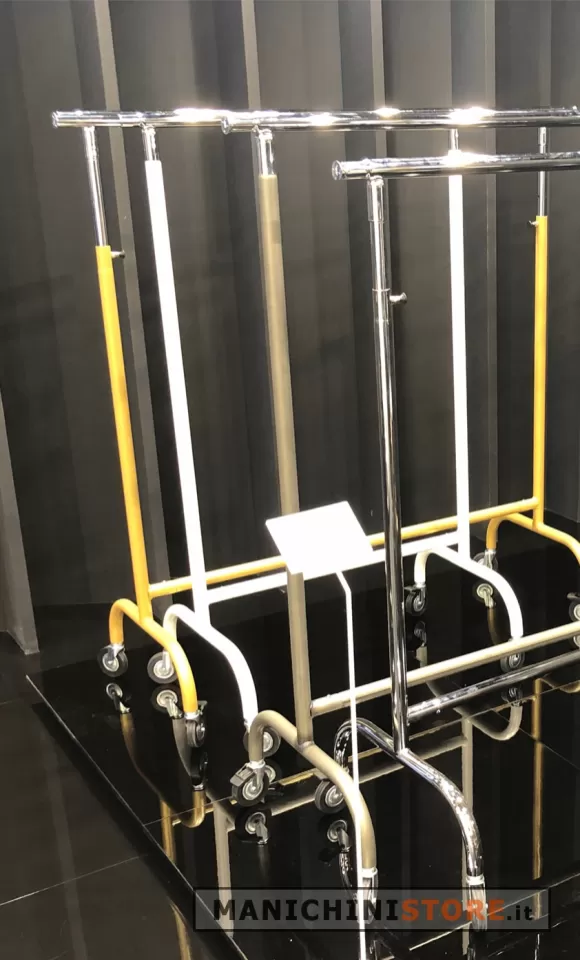 La barra appenderia e i montanti scorrevoli sono sempre cromati, mentre il resto della struttura può essere nelle finiture a catalogo.