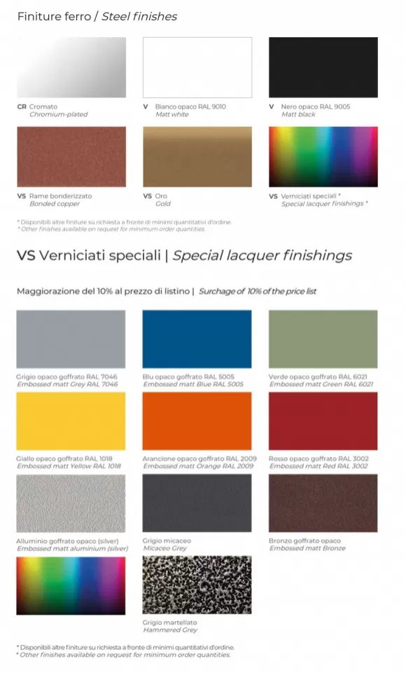 Verniciati standard (bianco opaco, nero opaco, grigio martellato) Finitura galvanica (cromato)