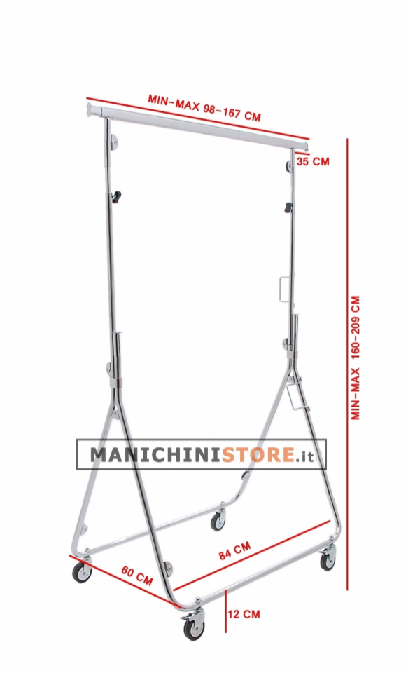 Lo stender ha un' altezza massima di 209 cm e una altezza minima di 160 cm con profondità 60cm, larghezza da cm 98 a cm 169.