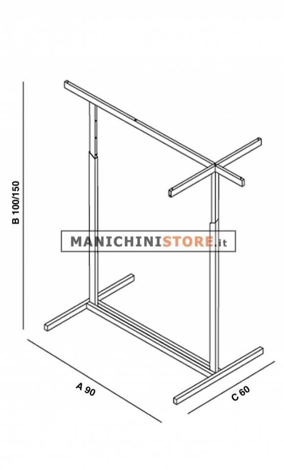 Lo stender misura 90 cm di lunghezza fissi, una profondità di 60 cm ed è regolabile in altezza, da una minima di 100 cm a una massima di 150 cm.